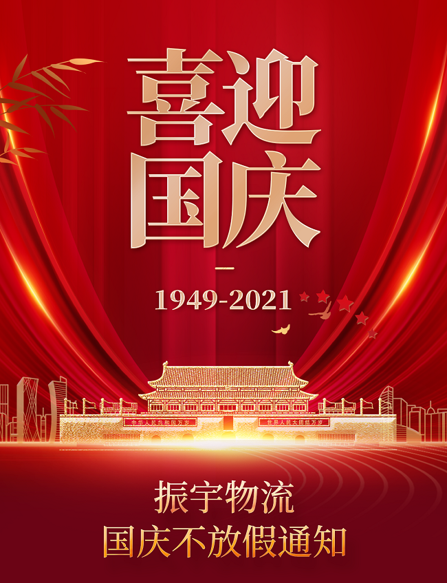 您好!正值秋高氣爽天,恰逢稻熟豐登日,祖國母親即將迎來72周年華誕。五星紅旗迎風(fēng)飄揚(yáng),我們同慶祖國華誕的榮光!振宇物流為了給您提供更好的服務(wù),并結(jié)合我司實(shí)際情況,現(xiàn)對(duì)國慶假日期間做出如下工作安排: