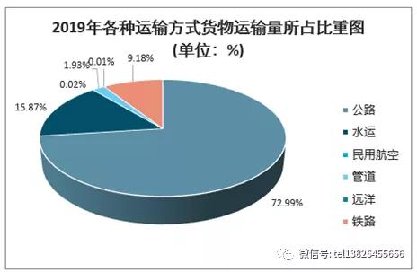 從貨物運(yùn)輸?shù)姆绞嚼矗愤\(yùn)輸仍然占據(jù)著我國(guó)貨物運(yùn)輸行業(yè)的主導(dǎo)地位。2019年各種貨運(yùn)運(yùn)輸量中公路運(yùn)輸量占比最大,達(dá)到了72.99%;其次為水運(yùn),占比為15.87%;鐵路運(yùn)輸量占比9.18%,位居第三。我國(guó)民航運(yùn)輸業(yè)起步較晚,仍處于發(fā)展階段,貨機(jī)數(shù)量整體來(lái)說(shuō)相對(duì)較少,這導(dǎo)致2019年民航貨運(yùn)量占比僅有0.02%。