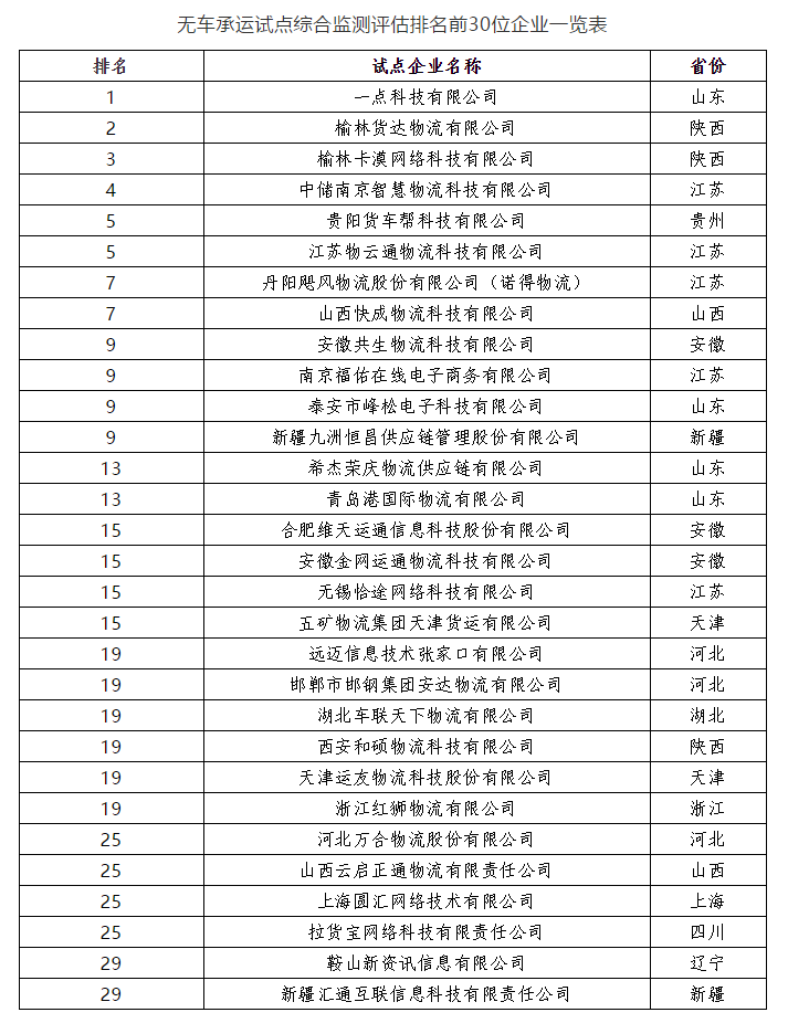 無(wú)車(chē)試點(diǎn)排名前30的,50%以上都是跟大宗運(yùn)輸相關(guān)