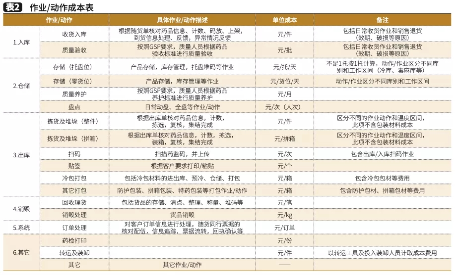 按照倉(cāng)庫(kù)自建和租賃情況,完全成本法及變動(dòng)成本法,如表1。作業(yè)/動(dòng)作成本表,如表2。