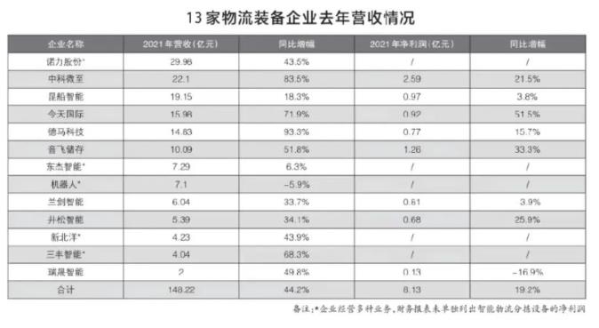 截至4月30日,A股主要上市企業(yè)均發(fā)布年報,其中包括以智能物流分揀系統(tǒng)為主要業(yè)務(wù)的11家企業(yè),加之即將IPO的2家企業(yè)披露全年業(yè)績,13家企業(yè)2021年營收合計為148.1億元,2020年為102.8億元,增長44.2%(見圖表)。