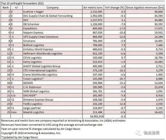 7月11日消息,第三方物流咨詢機(jī)構(gòu)Armstrong&Associates.Inc發(fā)布了最新的2022年航空貨代TOP25排名。前25家空運(yùn)貨代公司的總貨量同比下降了6.3%,達(dá)到1690萬噸。其中,前五名延續(xù)去年的排名,分別為德迅(K+N)、DHL、DSV、DB Schenker、Expeditors。德迅憑借223萬噸的空運(yùn)貨量,進(jìn)一步擴(kuò)大了對DHL的領(lǐng)先優(yōu)勢,再次成為全球最大航空貨運(yùn)代理公司。排名第二的DHL去年空運(yùn)貨物量下降了9.3%,達(dá)到190萬噸,反映出了整體空運(yùn)貨代市場的情況。