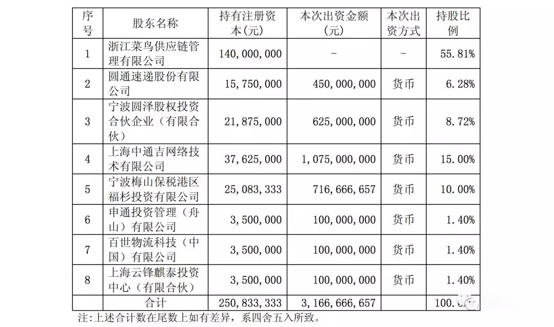 公告顯示,2018年第一季度,浙江驛棧總資產(chǎn)6922萬元,總負債7257.9萬元,凈資產(chǎn)-335.9萬元,營業(yè)收入483.3萬元,凈利潤-1.14億元。本次增資前,浙江驛棧由浙江菜鳥供應(yīng)鏈100%控股,本次增資后浙江驛棧的股本結(jié)構(gòu)如下: