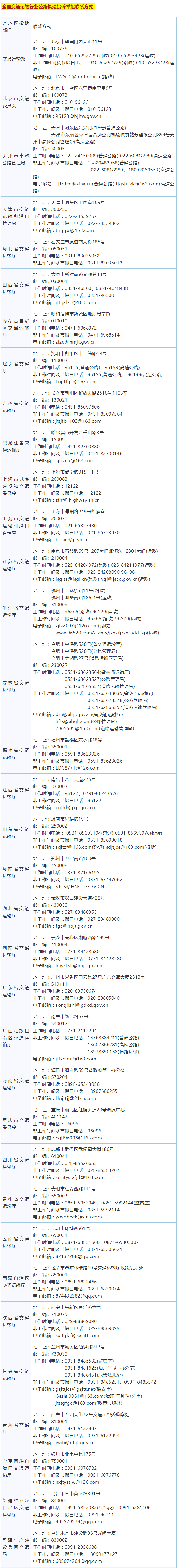 交通運輸部公路局、道路運輸司聯(lián)合向社會集中公布全國交通運輸行業(yè)公路執(zhí)法行風(fēng)投訴舉報電話、通信地址和電子郵箱地址。